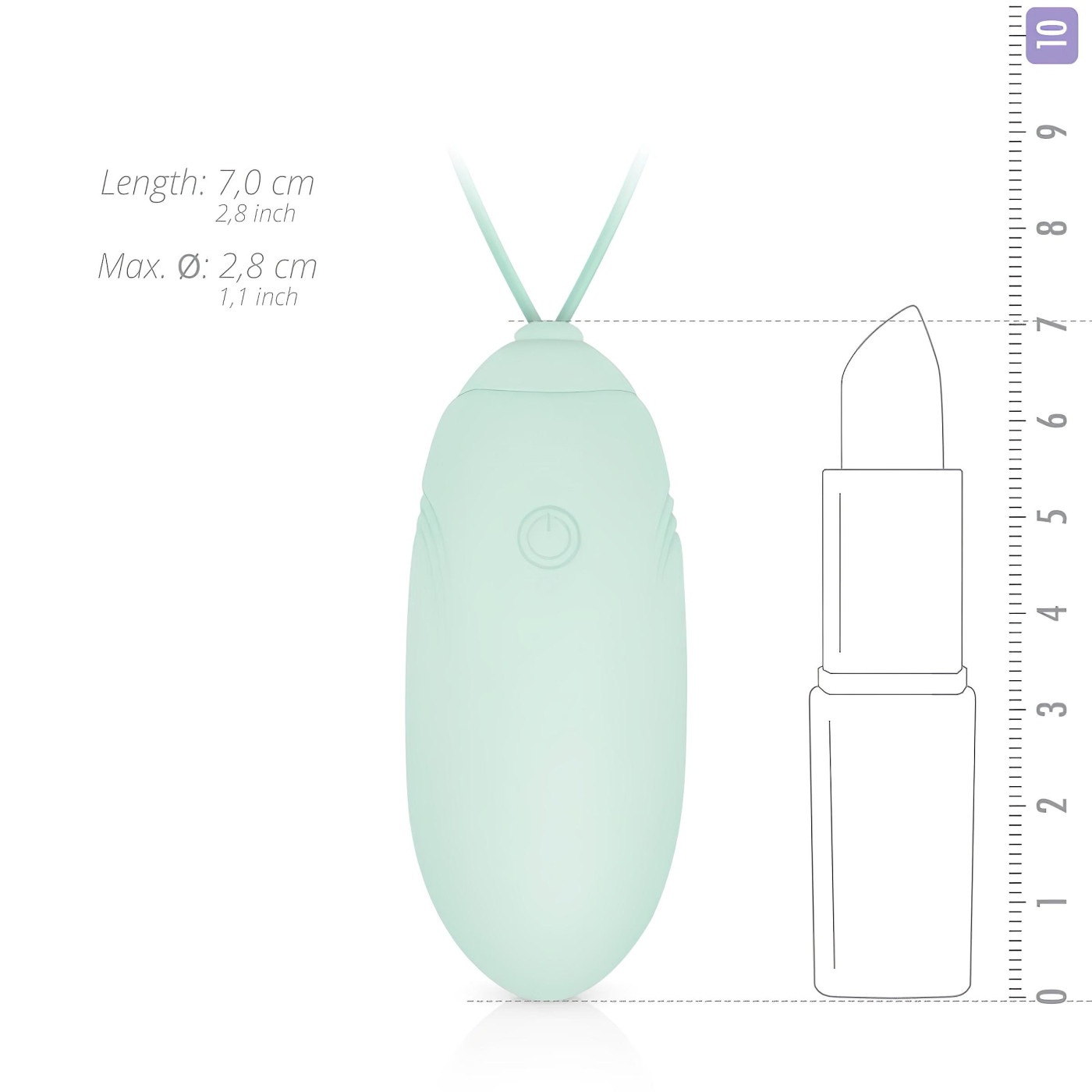 Features: Solid, excellent vibration conducting material with skin-friendly silicone coating Rounded, egg shape Wireless remote control Water resistance: IPX5 - protected against low-pressure water jets for at least 3 minutes Remote is not water-resistant 10 vibration modes Easy control with the remote or the device Remote works with a battery (1 x CR2032 button cell included in the remote) Built-in battery in the egg USB charging cable included in the package Charging time: 90 minutes Up to 30 minutes of continuous use Total length (with pull cord): 15.8 cm Egg length: 6.9 cm Egg maximum diameter: 2.5 cm Remote size: 7.8 x 3.7 x 2 cm Color: Green Material: ABS, Silicone (phthalate-free according to EU regulation) Cleaning recommendation: Clean with mild soapy, lukewarm water, then rinse off. For maximum hygiene, treat with a special disinfectant, which should also be rinsed off. Available separately: Cleaner for intimate toys - item number: 8718627520062.