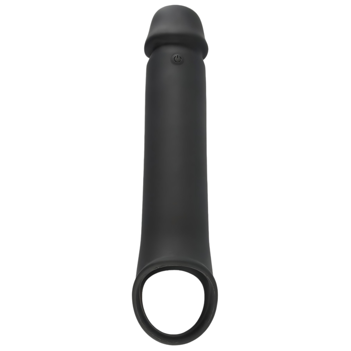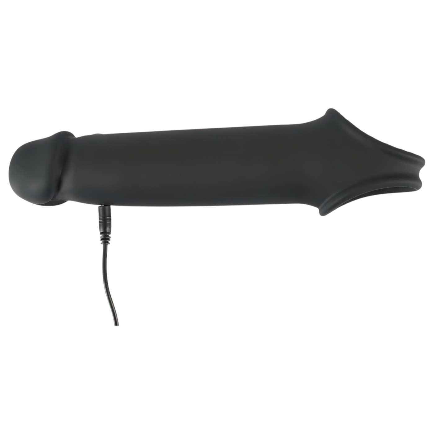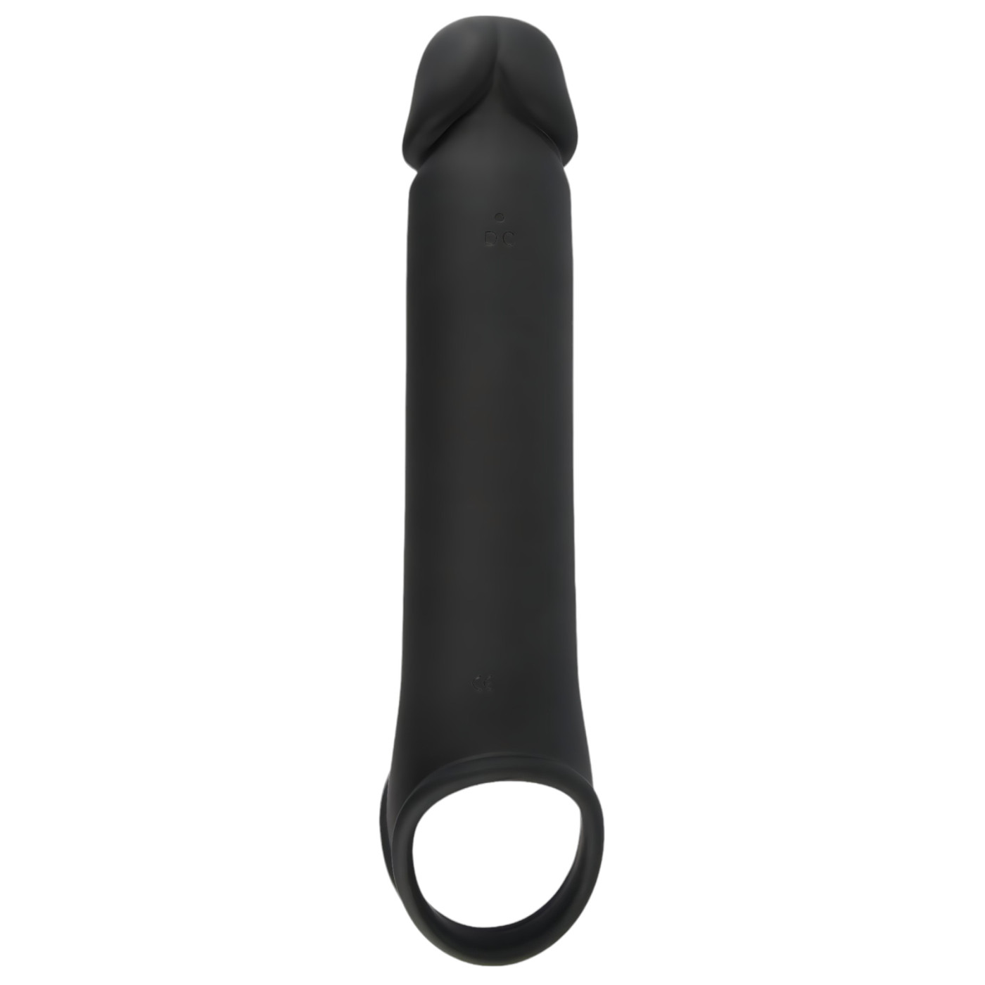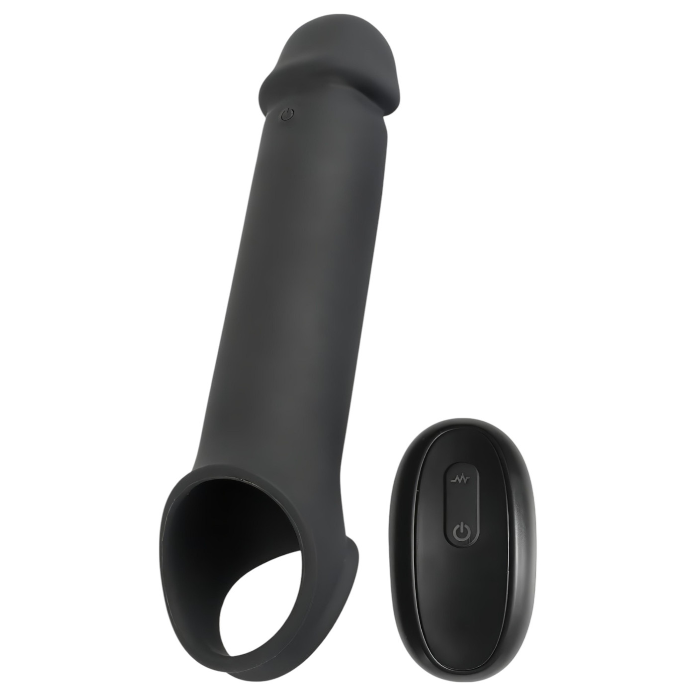 Stimulating vibrating, skin-friendly, thickening and strongly elongating penis sleeve with a secure, scrotal ring design.